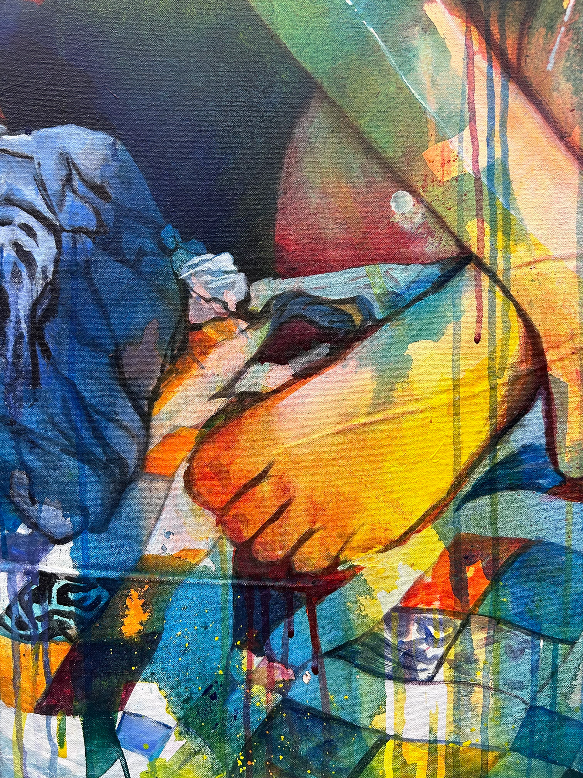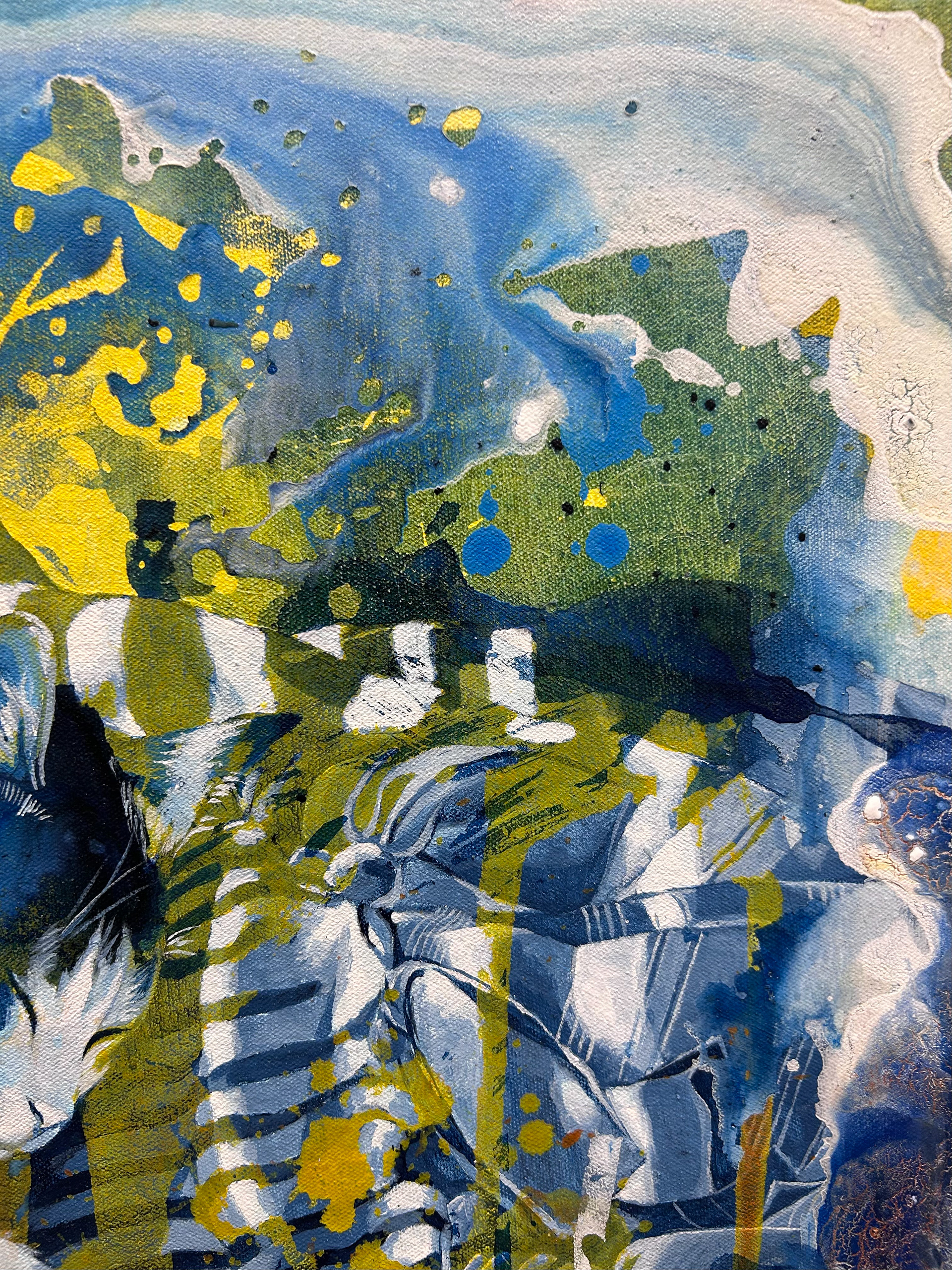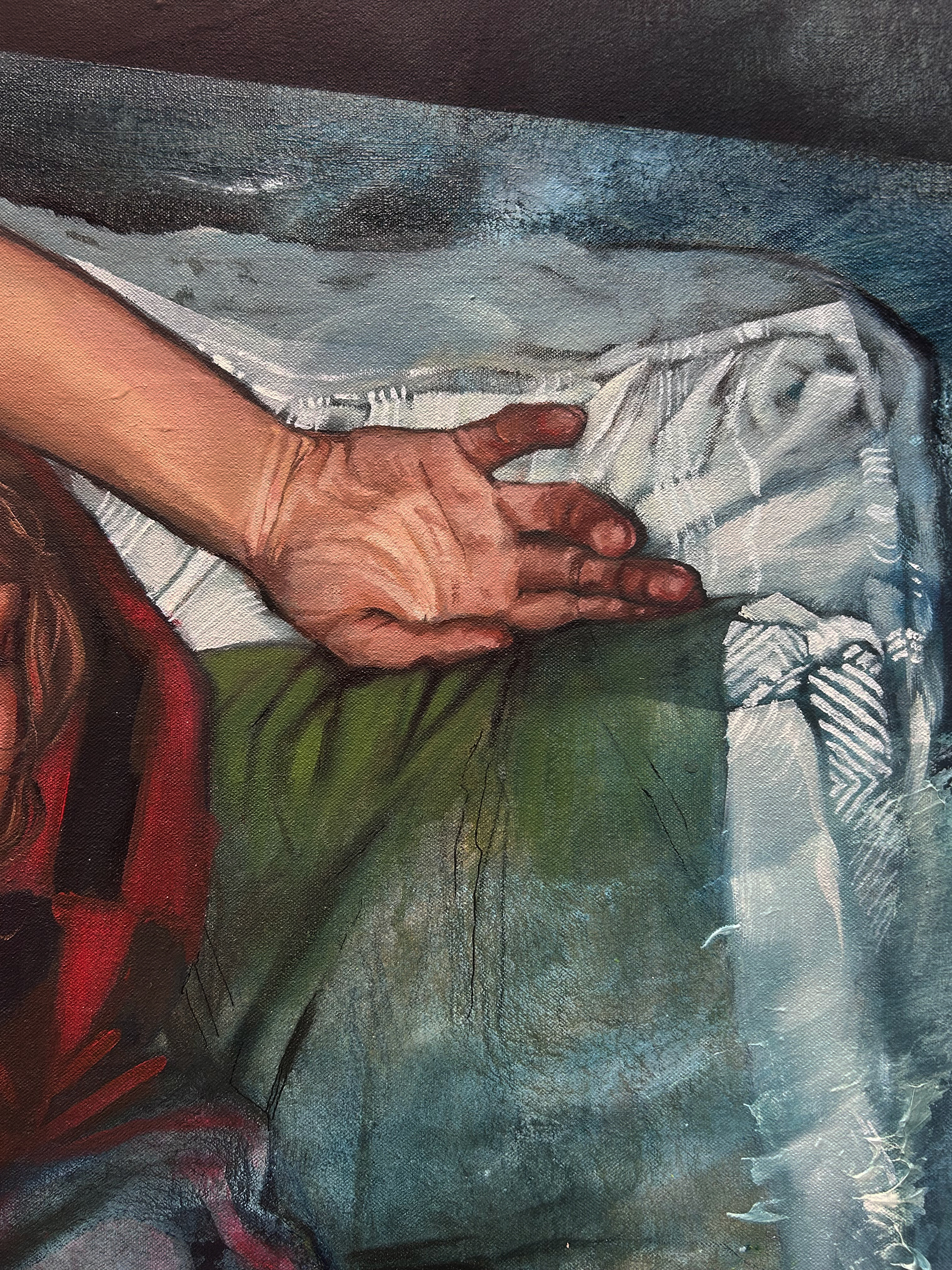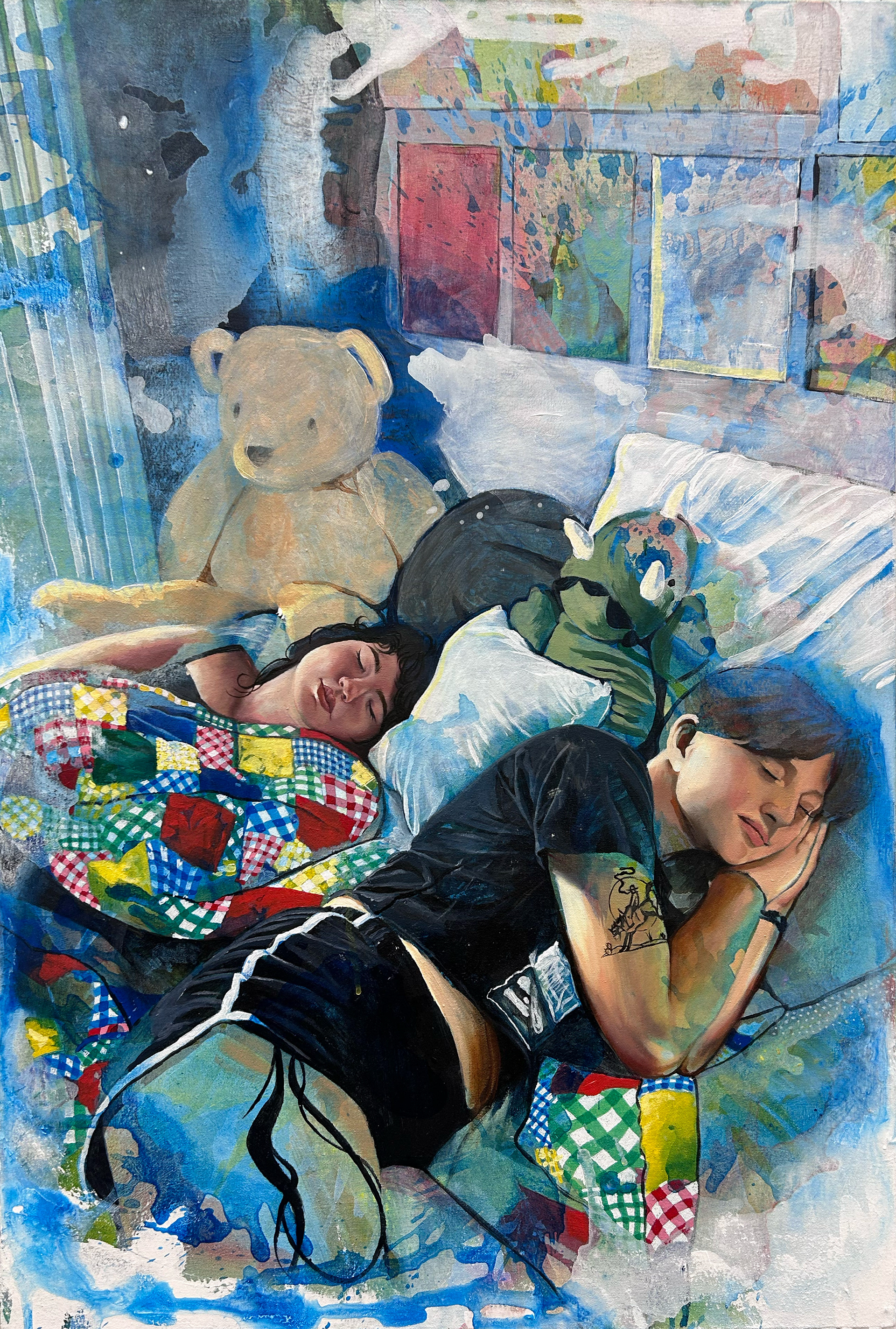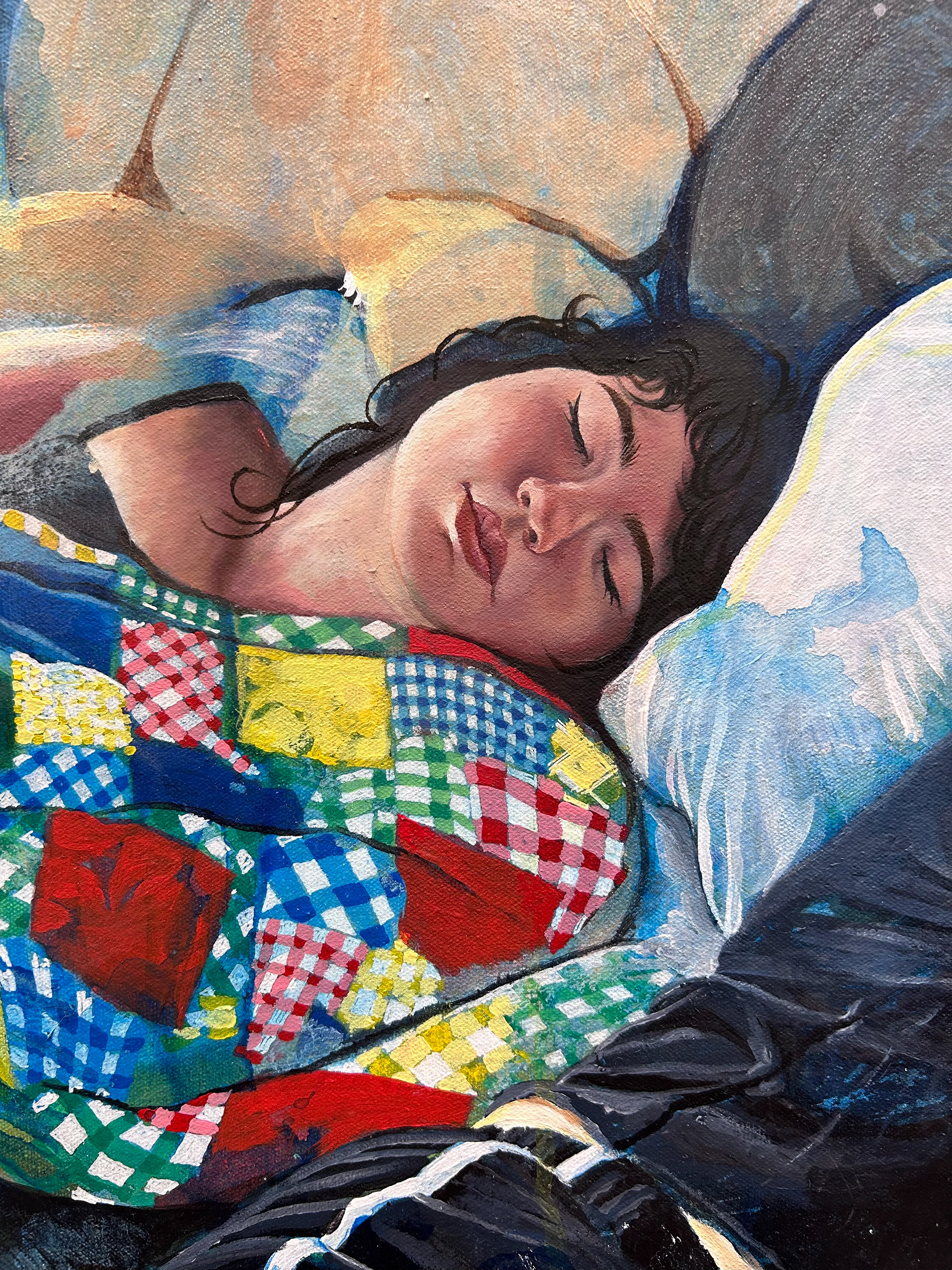 Working in acrylic with oil for finishing details, I build each piece through layered washes and poured paint. The poured passages create dreamy atmospheres where forms dissolve into color, inviting the viewer to get lost in the haze the same way one sinks into a dream. The quilts, textured and grounding, become both physical objects and emotional anchors, places where comfort, memory, and vulnerability intersect.