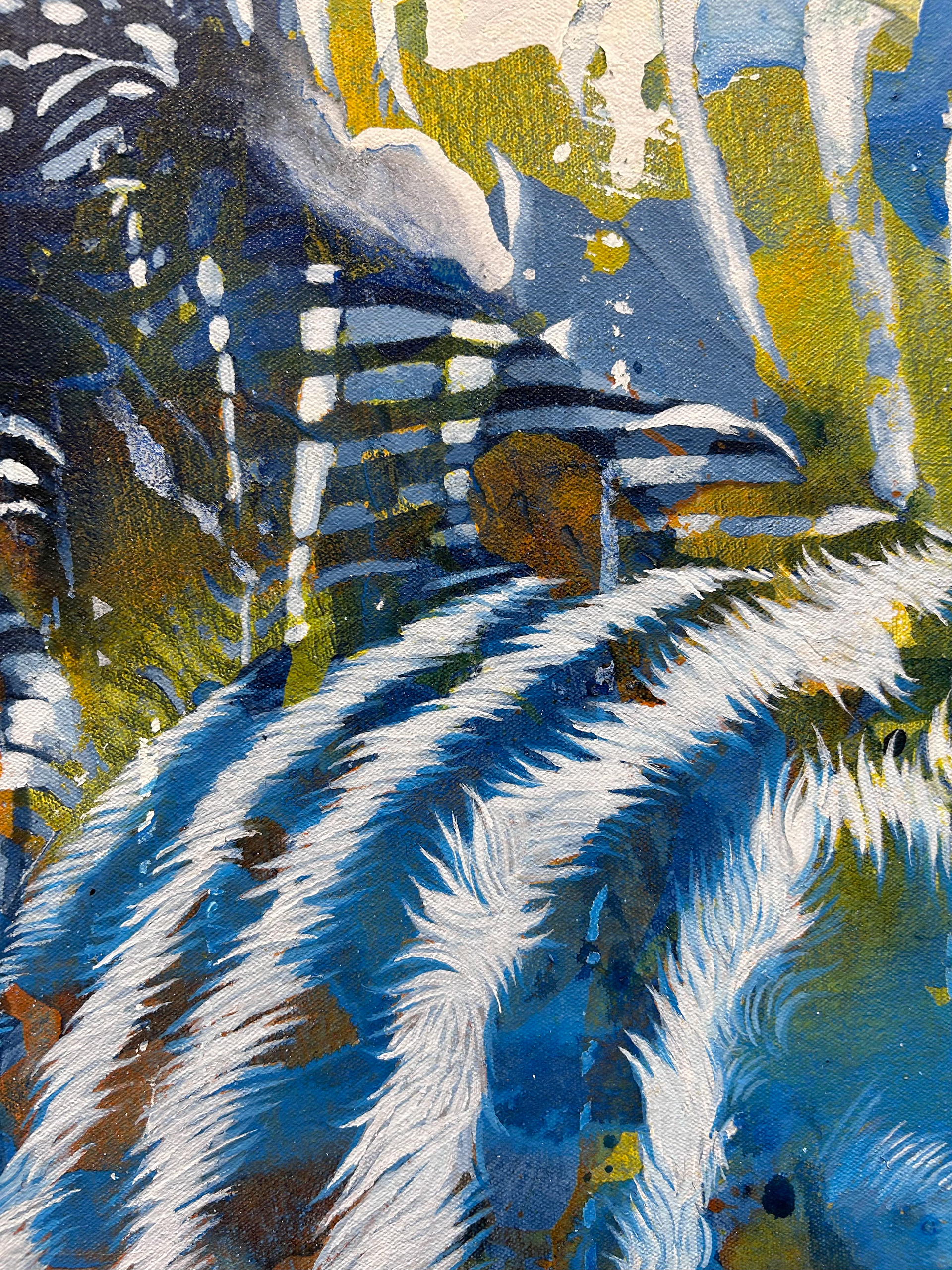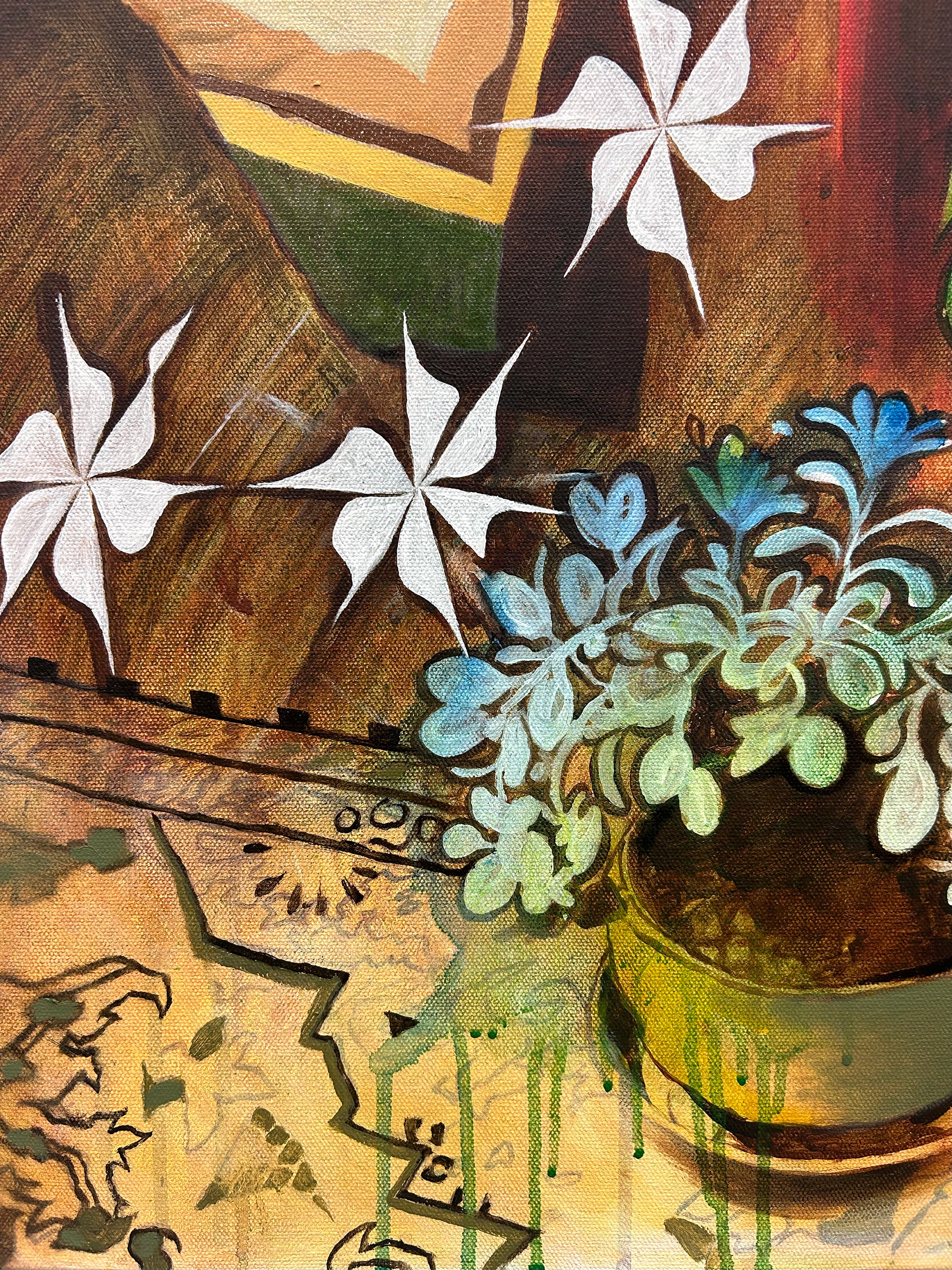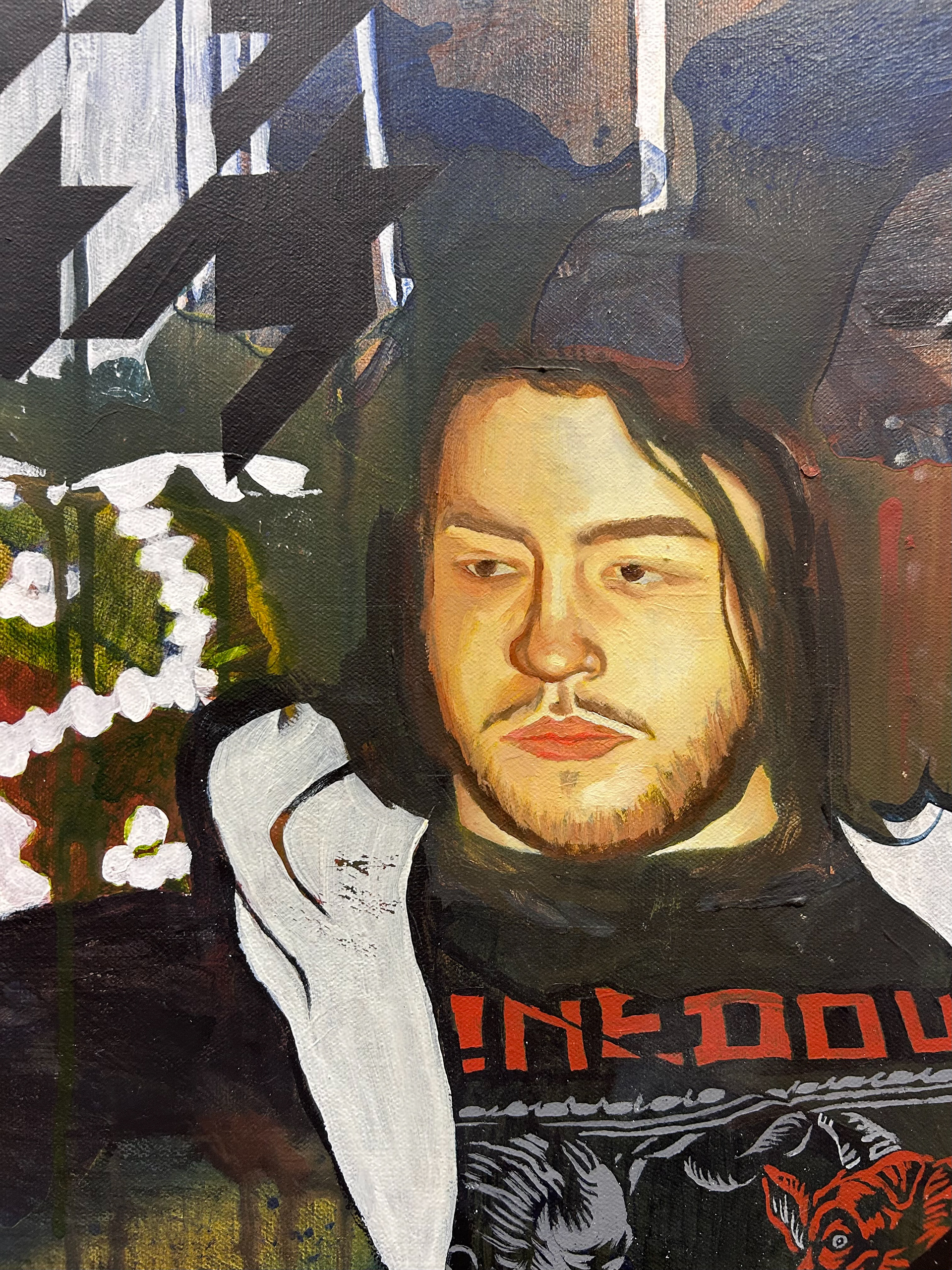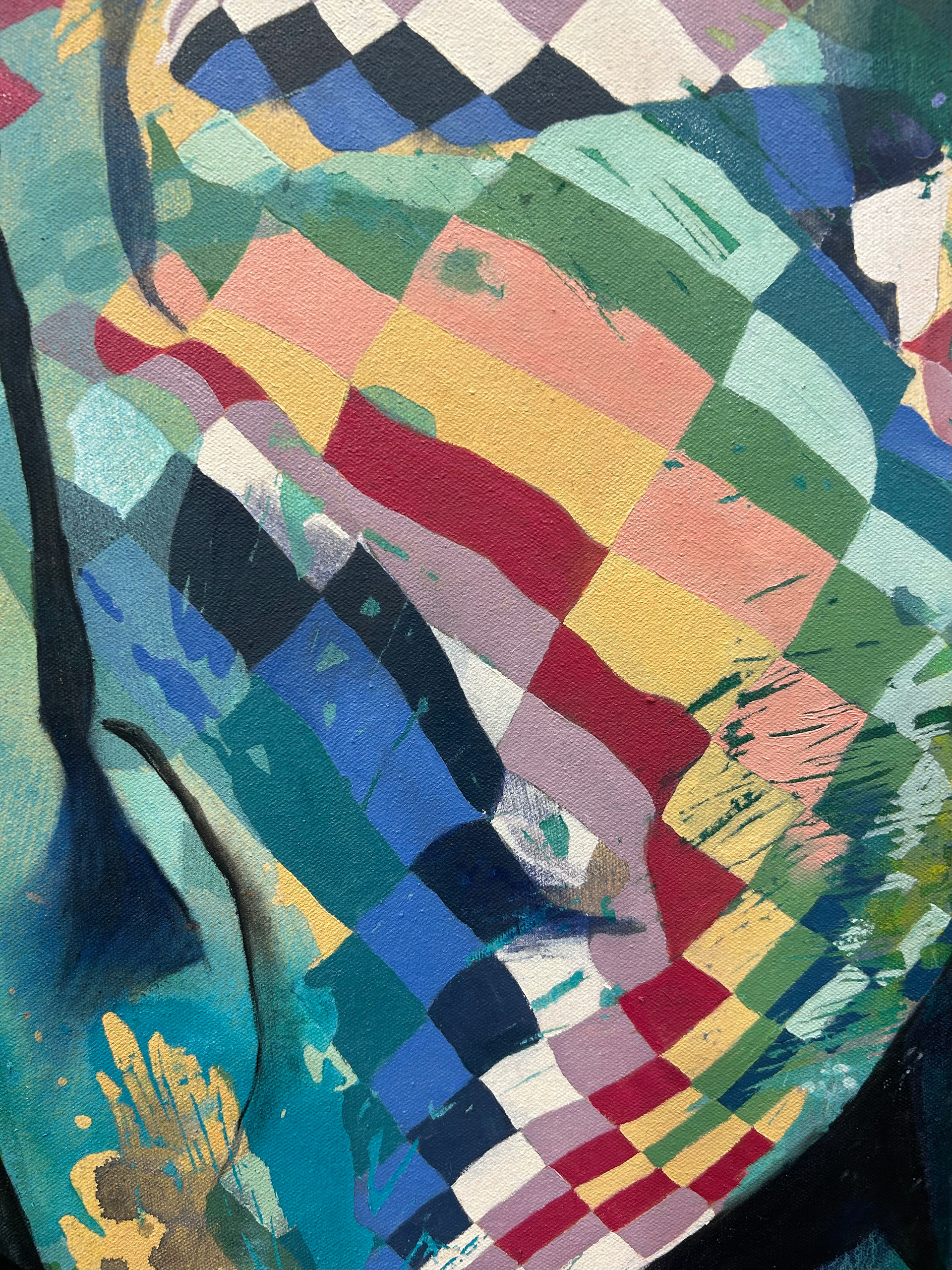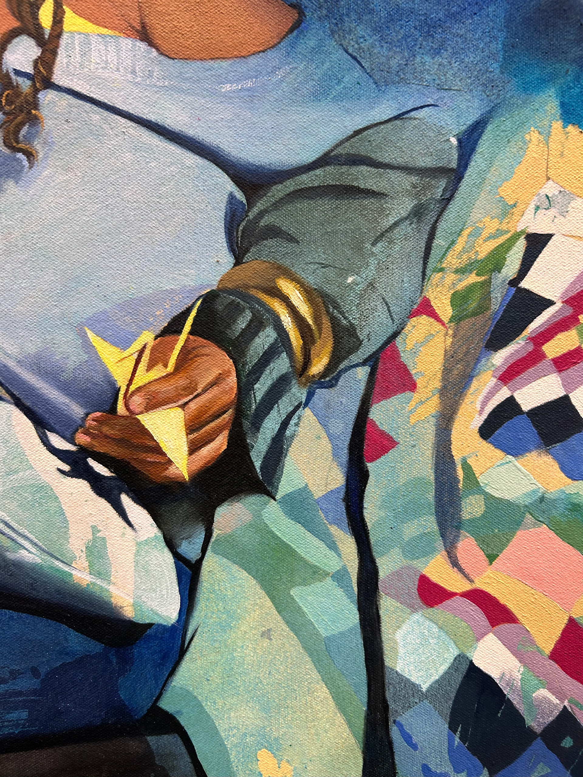 Working in acrylic with oil for finishing details, I build each piece through layered washes and poured paint. The poured passages create dreamy atmospheres where forms dissolve into color, inviting the viewer to get lost in the haze the same way one sinks into a dream. The quilts, textured and grounding, become both physical objects and emotional anchors, places where comfort, memory, and vulnerability intersect.