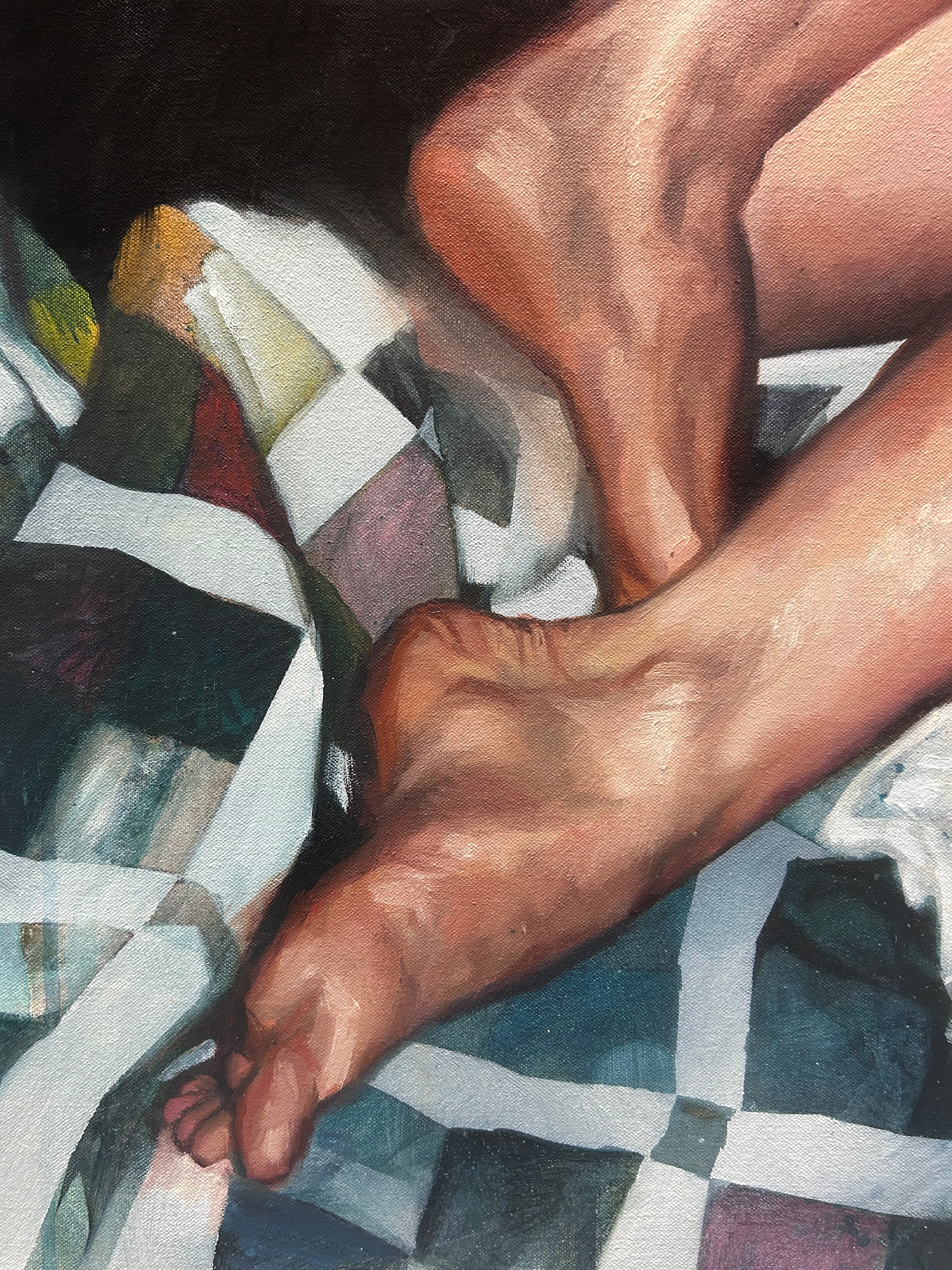 Sleep is my refuge. My paintings center around rest and the quiet interior spaces we retreat to. Each composition includes a quilt and figures in relaxed, vulnerable poses. I’m drawn to this subject matter because I’ve been sleeping a little too much, and I’ve become fascinated by how sleep can be a sanctuary, a pause, or a way of processing emotion.
